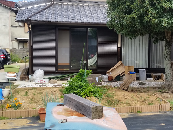 家庭菜園スペースでは土壌改良を行い、石や景石を再利用しています。